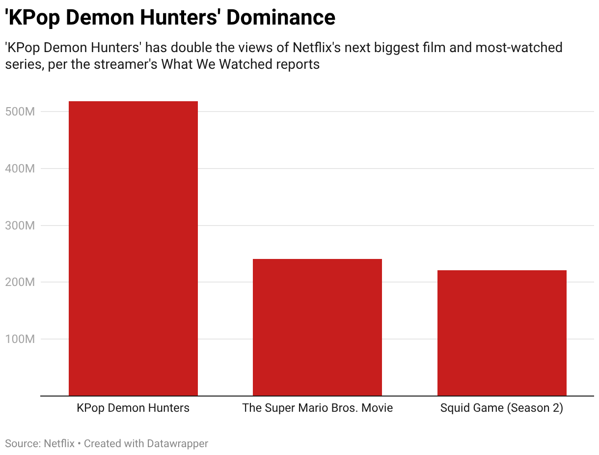 Caçadores de Demônios KPop acumulou 482 milhões de visualizações entre julho e o final de dezembro, mas isso não inclui os 36,7 milhões de streams registrados nos 10 dias após seu lançamento em 20 de junho de 2025.