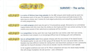 “A natureza episódica do programa atrai e prende os espectadores da mesma forma que um drama, mas mantém a autenticidade contundente e a imprevisibilidade convincente da programação do reality”, diz o documento. “Nas condições mais difíceis já vistas na TV, quinze competidores deixarão a ilha de mãos vazias. Um deles sairá triunfante, o único sobrevivente – e um milionário!”