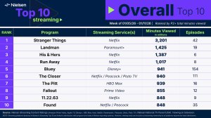 O gigante que é Coisas estranhas manteve facilmente seu primeiro lugar na lista geral de streaming, com impressionantes 3,2 bilhões de minutos assistidos de 5 a 11 de janeiro. Houve quatro programas que ultrapassaram 1 bilhão de minutos visualizados neste intervalo, incluindo também Landman, Dele e dela e Harlan Coben Fugir. Nada disso é particularmente surpreendente, uma vez que Coisas estranhas e Landman vinha dominando as paradas nas semanas anteriores, e os próprios relatórios de audiência da Netflix já mostraram a forte audiência de Dele e dela e Fugir.