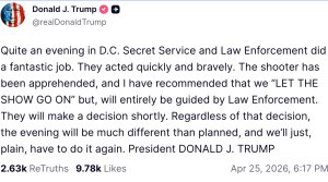 Acredita-se que ainda esteja em uma sala segura no Washington Hilton, Trump postou online: “Eles agiram rápida e corajosamente. O atirador foi detido, e eu recomendei que “DEIXEMOS O SHOW CONTINUAR”, mas seremos inteiramente guiados pelas autoridades. Eles tomarão uma decisão em breve. Independentemente dessa decisão, a noite será muito diferente do planejado, e nós simplesmente teremos que fazê-lo novamente.”