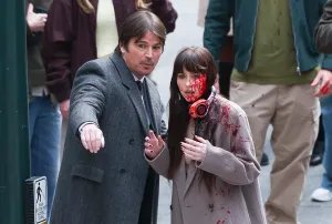 Dakota Johnson e Josh Hartnett foram vistos filmando ‘Verity’ em Pershing Square em 12 de março de 2025 na cidade de Nova York.