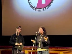 A produtora Alison Byrne Fields e o moderador Steven Bognar em True/False.