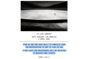 West lançou um site promovendo o show e pedindo aos fãs que insiram seus endereços de e-mail e “pré-salvem Bully” para “concluir seu pré-registro para ver Ye ao vivo em Los Angeles”. Alguns pré-inscritos receberão ingressos grátis, de acordo com o site. A SoFi também lançou uma página promocional para o evento.
