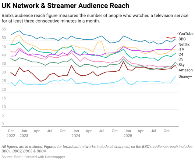 Um porta-voz da BBC disse: “O Reino Unido assiste significativamente mais TV da BBC do que qualquer outro provedor. Em 2025, o público do Reino Unido assistiu 351 milhões de horas na BBC por semana, o que está muito à frente de qualquer outro. Quando nos concentramos no alcance, consideramos um mínimo de 15 minutos como uma medida apropriada para conteúdo de formato longo e, por essa medida, a BBC continua a liderar.”