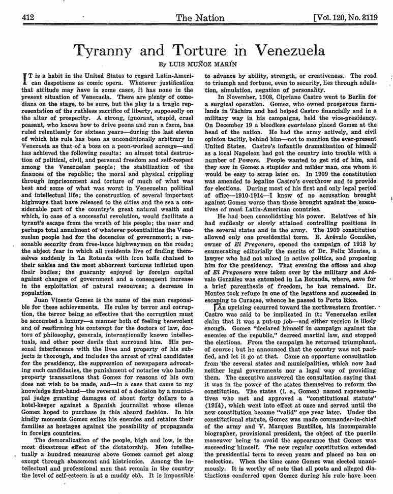 Lamentavelmente, foi exactamente isso que o governo dos EUA fez, interferindo repetidamente na América Latina para apoiar governantes que atacavam o seu próprio povo e serviam interesses corporativos. De 1908 a 1935, a Venezuela foi governada por Juan Vicente Gómez, um ditador que governou “pelo terror e pela corrupção”, como escreveu o grande jornalista e político porto-riquenho Luis Muñoz Marín nestas páginas em 1925. Gómez invocou a lei marcial, substituiu a constituição e torturou e prendeu os seus críticos. “A imagem é sinistra e grotesca”, concluiu Muñoz Marín.