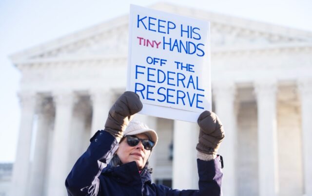Uma mulher protestou em frente ao Supremo Tribunal enquanto ouvia argumentos orais em Trump x Cooksobre a tentativa de Trump de demitir Lisa Cook do Conselho de Governadores do Federal Reserve.