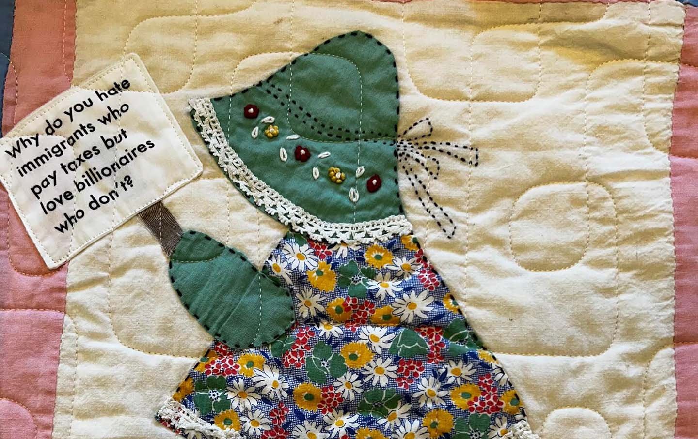 Jane PearlmutterJane Pearlmutter é uma artista têxtil que agora mora em Corvallis, Oregon. Em 2014, ela se juntou ao Memory Cloth Circle, um grupo de artistas em Madison, Wisconsin, e se apaixonou por reaproveitar tecidos vintage. Ela também participou e expôs em vários projetos têxteis de crowdsourcing com tendência política, como o Projeto Tiny Pricks.