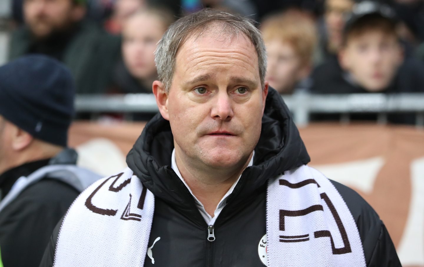 Oke Göttlich, presidente do FC St. Pauli, observa antes da partida da Bundesliga entre FC St. Pauli 1910 e FC Bayern München no Estádio Millerntor em 9 de novembro de 2024, em Hamburgo, Alemanha.