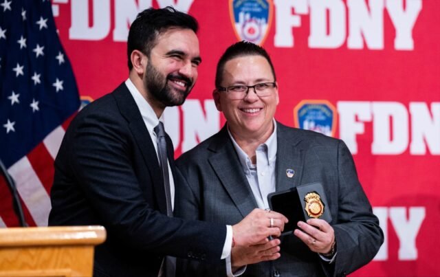 O prefeito da cidade de Nova York, Zohran Mamdani, e Lillian Bonsignore, comissária do Corpo de Bombeiros de Nova York (FDNY), durante uma cerimônia de posse na sede do FDNY em 6 de janeiro de 2026.