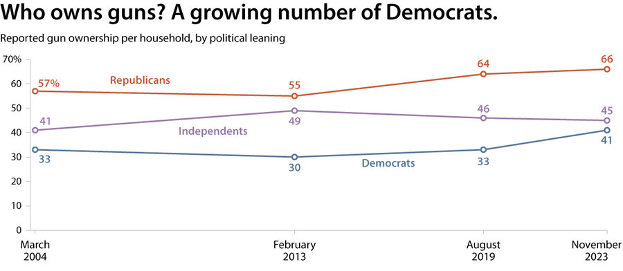 Nos EUA, a posse de armas por pessoas que se identificam como politicamente de centro-esquerda está a aumentar. Uma pesquisa da NBC News mostrou que o número de famílias democratas com armas aumentou de 33% em 2019 para 41% cinco anos depois. Outros estudos confirmam que a cultura das armas é hoje muito mais diversificada do que é frequentemente retratado nos meios de comunicação social, e que o activismo da Segunda Emenda é um factor-chave para muitos novos proprietários de armas.