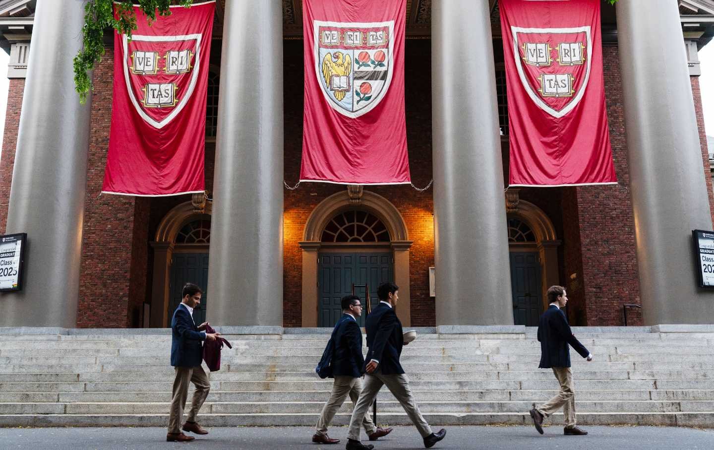 Faixas penduradas na Memorial Church, no campus da Universidade de Harvard, em Cambridge, Massachusetts.