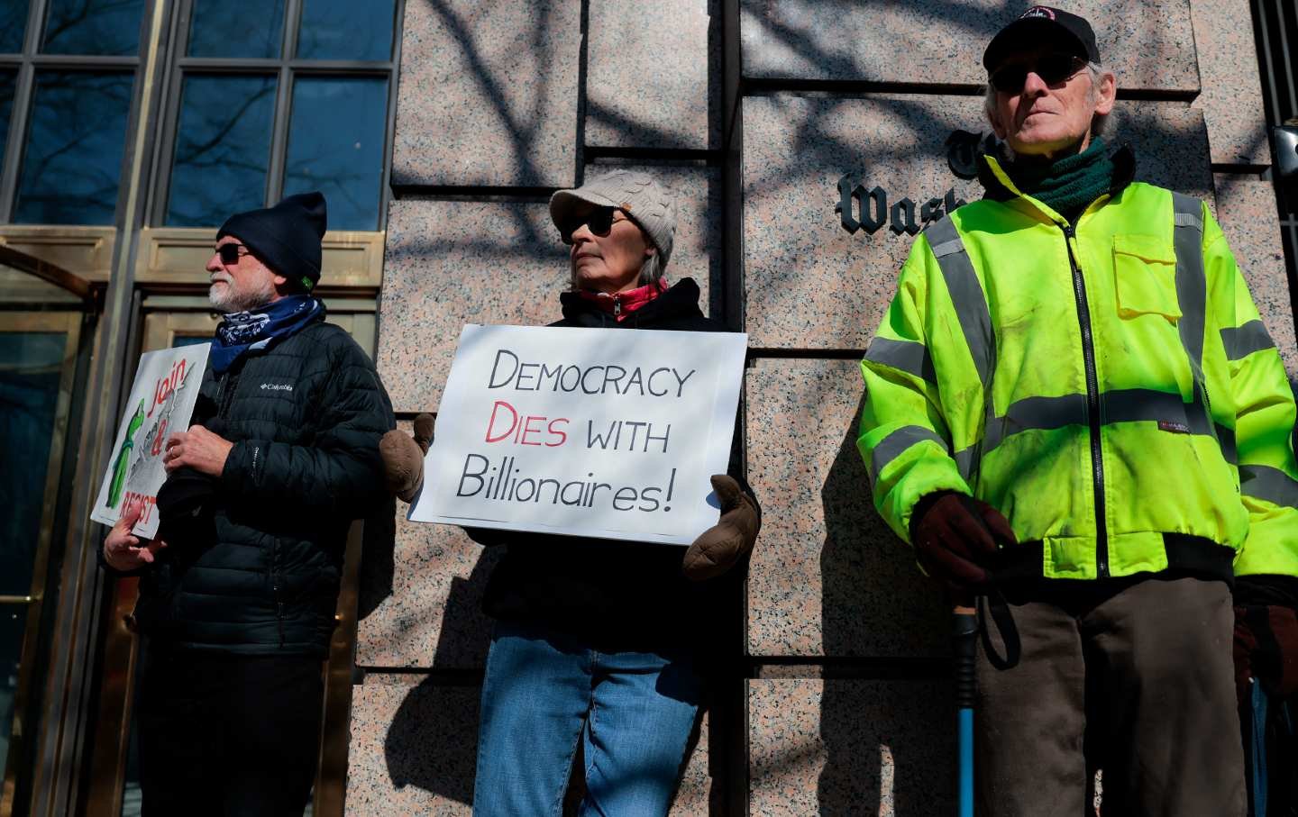Membros do NewsGuild se juntam a outros manifestantes durante um comício fora do Washington Post prédio de escritórios em 5 de fevereiro de 2026, em Washington, DC.
