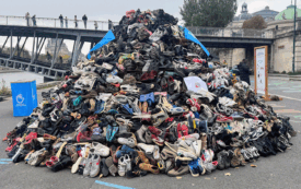 Em 2024, pelo menos 6.279 pessoas foram mortas ou feridas por resíduos explosivos de guerra. A campanha de sensibilização “Pirâmides de Sapatos” é organizada pela Handicap International e pela Campanha Internacional para a Proibição de Minas Terrestres, Paris, 2025.