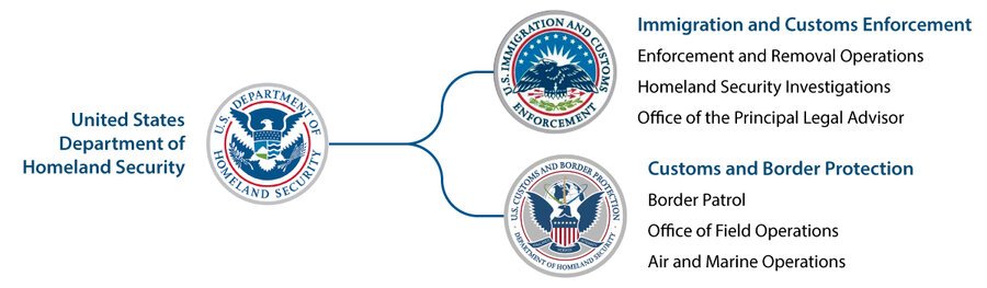 A secretária Kristi Noem lidera o amplo departamento. A Segurança Interna examina os viajantes nos aeroportos, concede financiamento para ajuda em desastres e supervisiona o Serviço Secreto. O DHS também abriga diversas agências envolvidas na imigração, incluindo as abaixo.