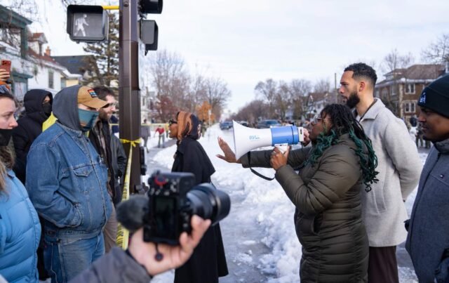 Robin Wonsley, membro do Conselho Municipal de Minneapolis, fala para uma multidão de espectadores perto do local onde agentes federais atiraram e mataram uma mulher na Avenida Portland, em Minneapolis, Minnesota, em 7 de janeiro de 2026.