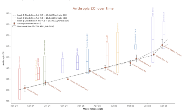 Este gráfico mostra como o Mythos se compara aos modelos Antrópicos anteriores na pontuação ECI, que combina vários benchmarks em um.