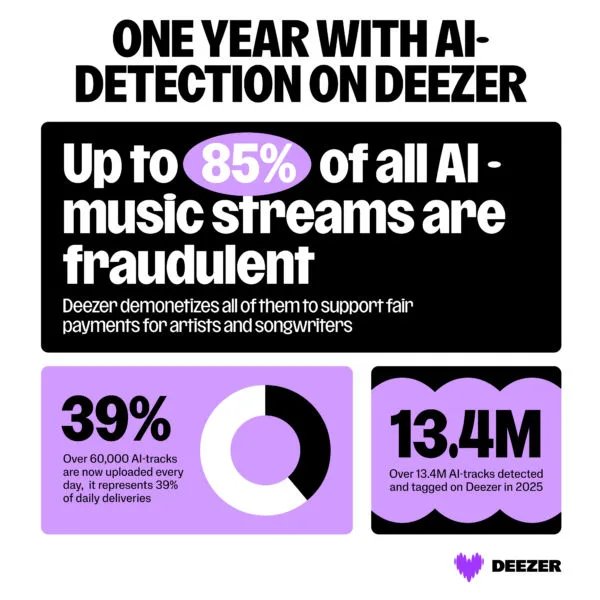 O momento é desconfortável. Semanas antes do anúncio da Apple, a Deezer divulgou números que mostram o que acontece quando a música AI encontra um sistema de honra. A plataforma agora recebe mais de 60.000 faixas totalmente geradas por IA todos os dias, cerca de 39% de todas as músicas entregues. Desde o início de 2025, a Deezer detectou mais de 13,4 milhões de faixas de IA no total.