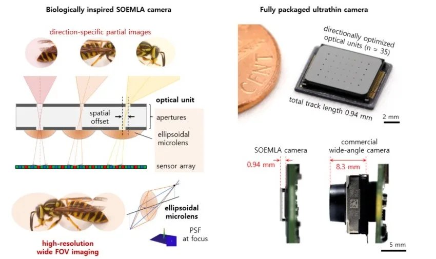 Este design baseia-se no sistema visual de um inseto parasita, que constrói uma imagem completa juntando vistas parciais. A equipe KAIST adaptou esse conceito de divisão e mesclagem, para que a câmera possa oferecer um amplo campo de visão e alta resolução sem aumentar a espessura.