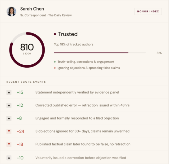 Mas isso não é suficiente para D’Souza, que disse que “usar uma fonte totalmente anônima que não tenha sido verificada de forma independente” levaria a uma menor evidência e pontuação de confiança na Objeção. Na rubrica da plataforma, os registros primários, como registros regulatórios e e-mails oficiais, têm o maior peso, enquanto as denúncias de denunciantes anônimos são classificadas perto da parte inferior. Essas informações são coletadas em parte por uma equipe de freelancers – ex-agentes da lei e jornalistas investigativos – e, em última análise, são inseridas no que a Objection chama de “Índice de Honra”, uma pontuação numérica que a empresa diz refletir a integridade, a precisão e o histórico de um repórter.
