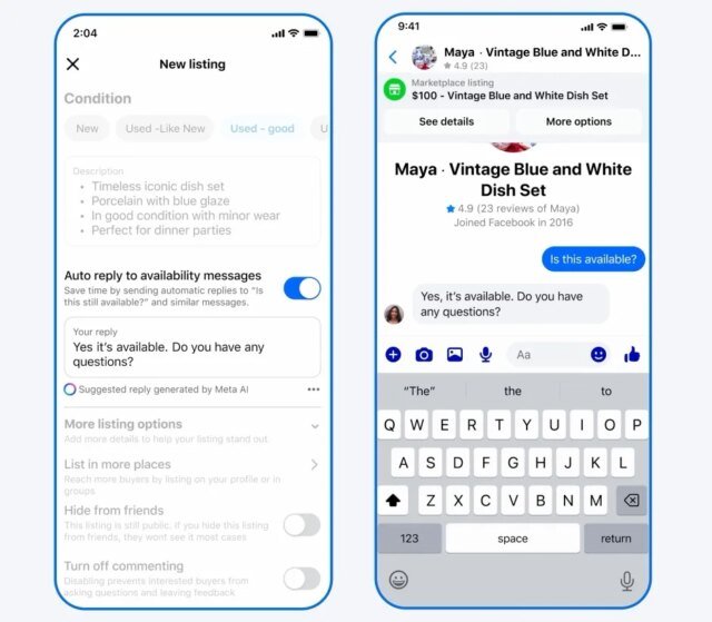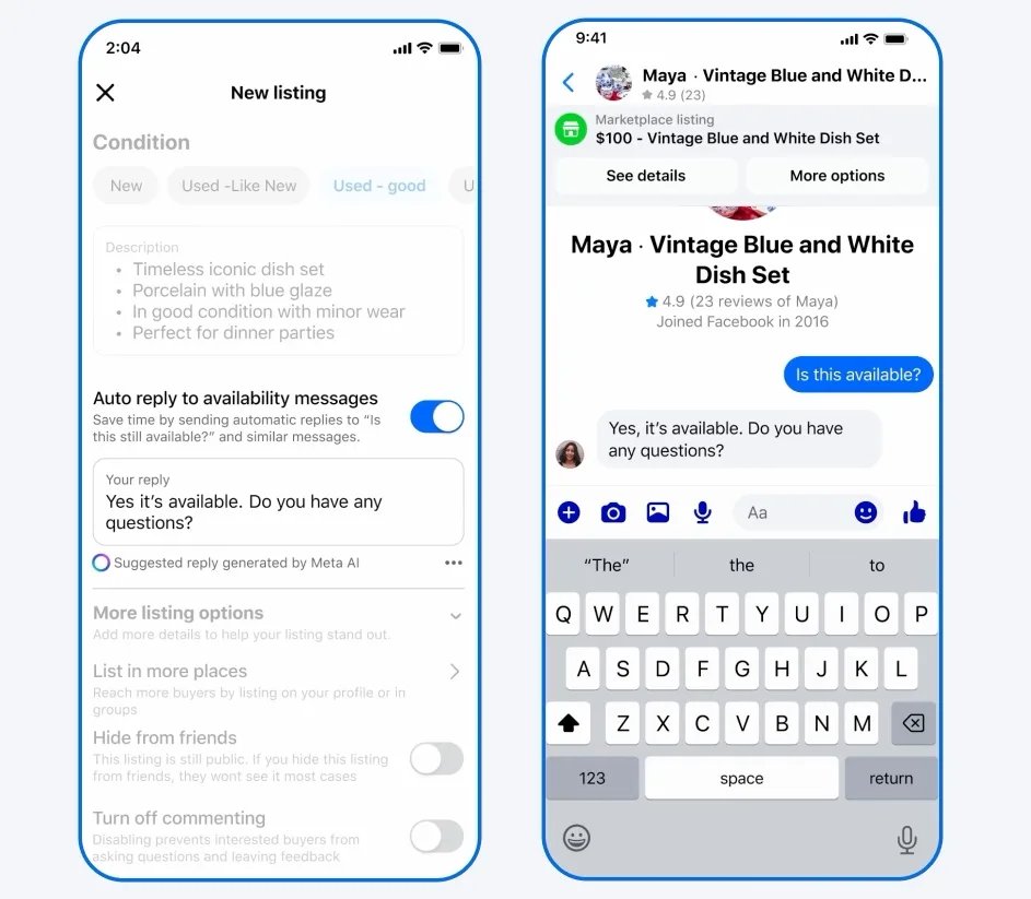 Meta acredita ter uma solução para o caos. A empresa está introduzindo ferramentas baseadas em IA no Marketplace que lidam com os textos dos compradores automaticamente. Os vendedores agora podem ativar respostas automáticas que extraem informações diretamente de suas listagens, incluindo preço, descrição e local de retirada, para responder perguntas comuns instantaneamente.