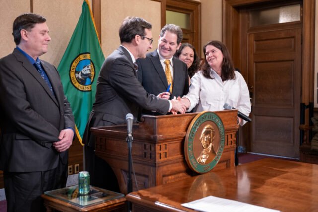 O governador Bob Ferguson aperta a mão da deputada Liz Berry (D-Seattle), patrocinadora do projeto de lei, após assinar o projeto de lei 1155 da Câmara, que proíbe quase todos os acordos de não concorrência no estado de Washington. (Foto do estado de Washington / Ian Couch)