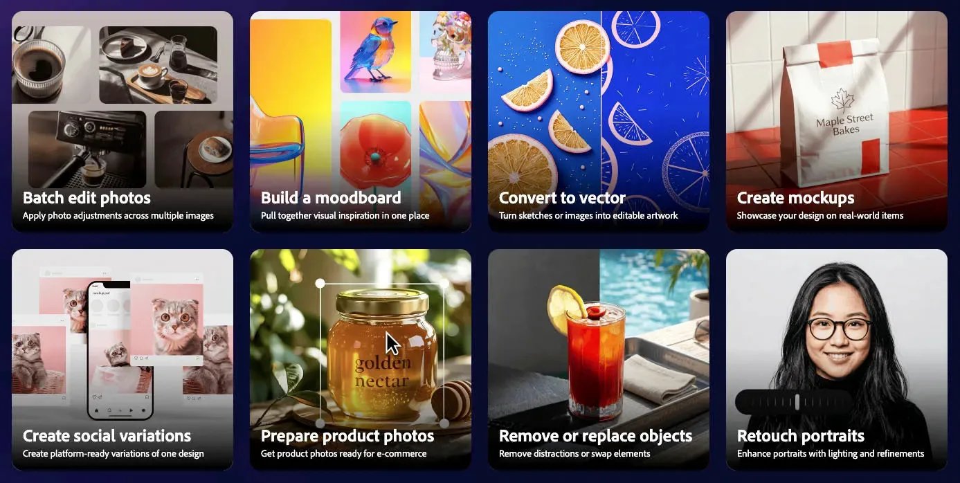 O assistente pode aproveitar mais de 60 ferramentas de nível profissional nos aplicativos da Adobe, incluindo Auto Tone, Generative Fill, Remove Background e Vectorize. Se você é um designer gráfico que precisa de uma maquete de produto, pode fazer upload de um logotipo, uma imagem de produto e descrever o resultado desejado.
