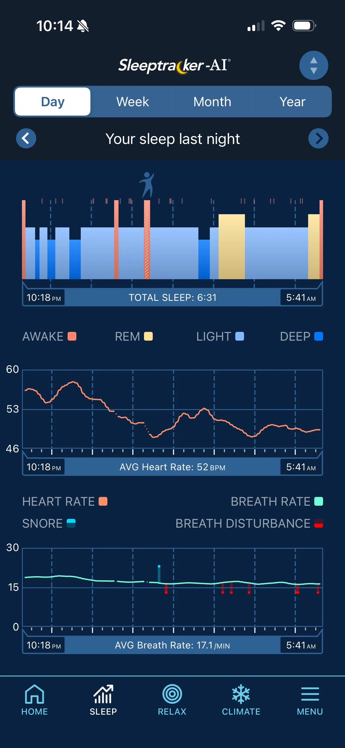 Você pode obter uma visão geral rápida dos estágios do sono alcançados com um gráfico de pizza mostrando alterações na frequência respiratória, variabilidade da frequência cardíaca, despertares e se você atingiu suas metas de sono. E essa é apenas a visão geral. Na aba “Sleep” do aplicativo, os dados são muito mais extensos, detalhando os pontos de dados gerais em gráficos, tabelas e métricas numéricas. Muitos desses dados se repetem nas visualizações, mas apreciei a variedade de recursos visuais que explicavam o que eu estava fazendo bem e o que precisava ser melhorado. Com o tempo, o aplicativo fornecerá detalhamentos diários, semanais, mensais e anuais de seus dados de sono.