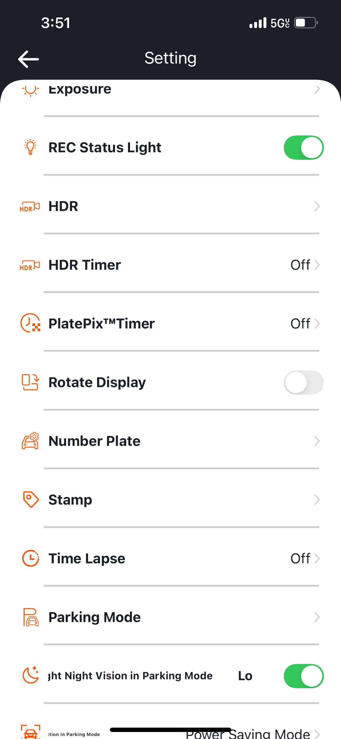 Na verdade, existem muitas configurações. Por meio do aplicativo, você pode rastrear quilometragem, alternar o rastreamento GPS, definir a taxa de quadros e a resolução da câmera e definir se deseja que a câmera use configurações de alta faixa dinâmica ou PlatePix. O primeiro será mais útil quando a luz estiver fraca.