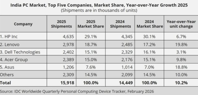 HP, Lenovo, Dell, Acer e Asus estavam entre os principais fornecedores de PCs na Índia no ano passado, disse a IDC. No entanto, os computadores Mac da Apple detêm uma participação menor no mercado de computadores pessoais da Índia do que nos EUA. Os MacBooks representaram cerca de 5,6% do mercado de notebooks da Índia em 2025, em comparação com cerca de 11% a 12% globalmente e cerca de 20% nos EUA, de acordo com a IDC.