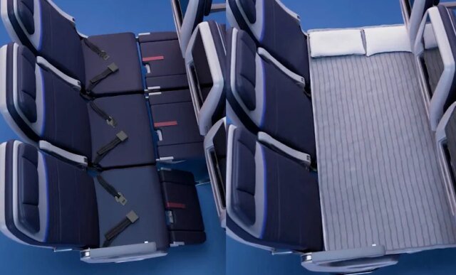A nova configuração é chamada United Relax Row e é essencialmente uma fileira de três assentos com apoios de pernas ajustáveis que se dobram 90 graus para criar um assento plano, semelhante a um sofá.
