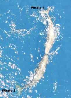 Uma cena do vídeo mostrando duas baleias dando cabeçadas uma na outra. © Burslem et al., 2026