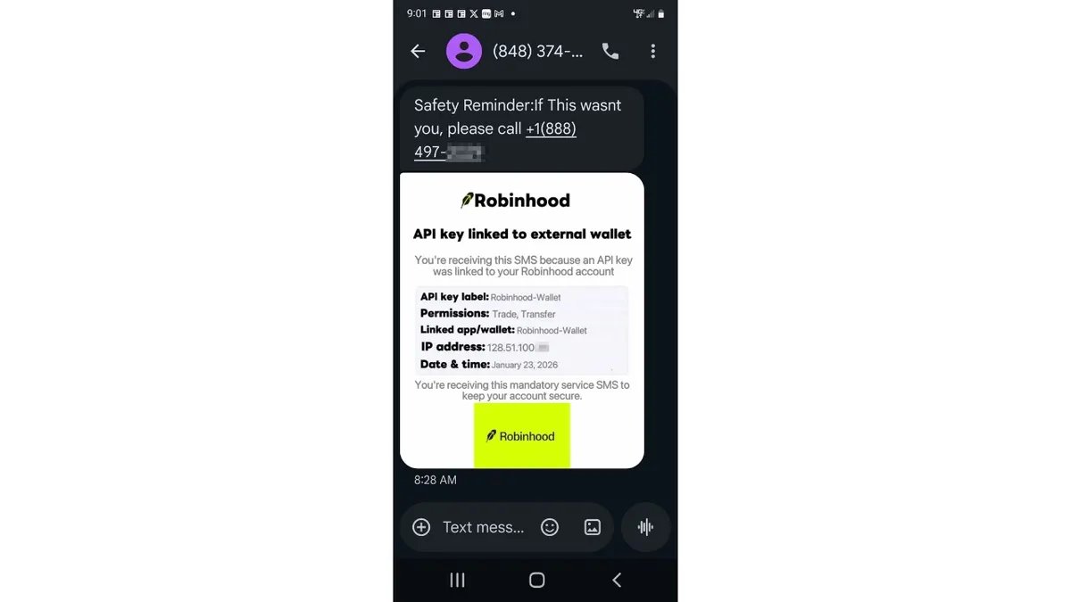 Receber este texto não significa que uma conta foi acessada. Mensagens como esta são enviadas em massa. Os números de telefone geralmente vêm de pessoas não relacionadas violações de dados e listas de marketing. O remetente não sabe quem realmente possui uma conta Robinhood. O golpe só funciona se alguém reagir.