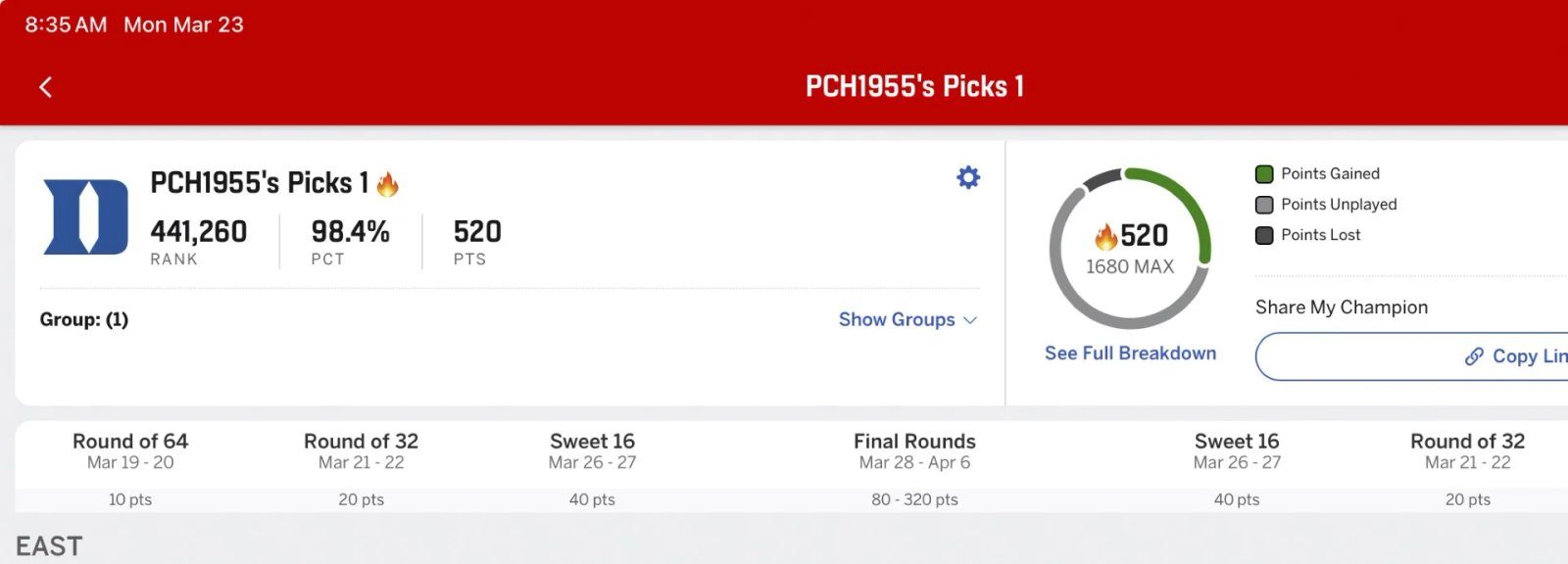 Após as duas primeiras rodadas, estou no topo do grupo dos meus amigos, com sessenta entradas, e do grupo da minha família, com seis. Para um tamanho de amostra mais amplo, meus colchetes estão no percentil 98 entre os 27 milhões de colchetes inscritos no desafio da ESPN.