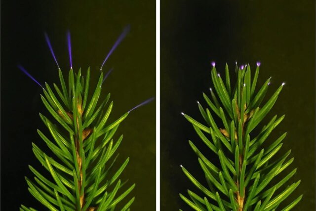 Os cientistas analisaram as imagens capturadas de árvores durante uma forte tempestade, detectando 41 coroas nas pontas das folhas no período de 90 minutos. Cada brilho durou aproximadamente três segundos, muitas vezes saltando de uma folha para outra.