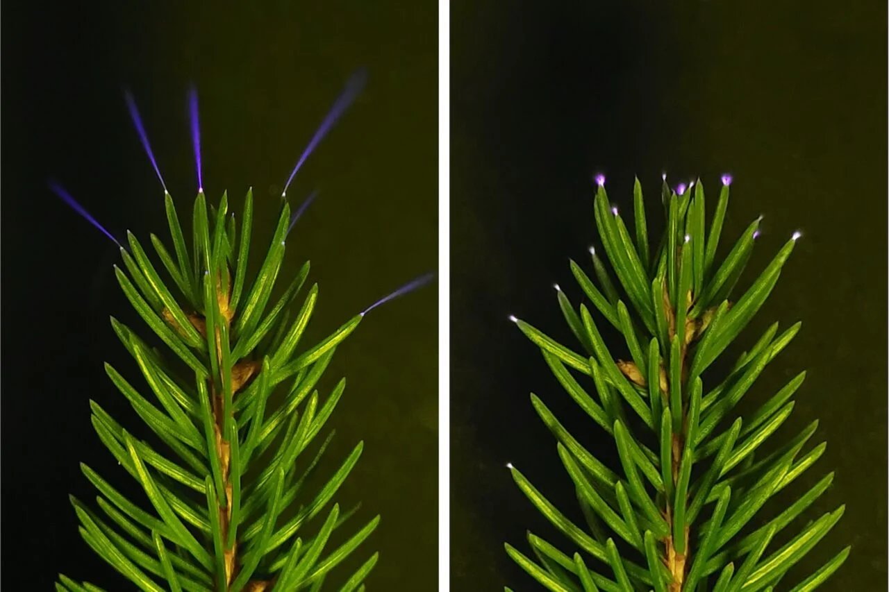 No verão de 2024, uma equipe de pesquisadores perseguiu uma tempestade em uma minivan Toyota Sienna em busca de pequenas e fracas faíscas iluminando as pontas das folhas. Enquanto uma tempestade assolava o céu, os pesquisadores apontaram suas câmeras para três galhos de uma árvore de eucalipto em Pembroke, Carolina do Norte. A filmagem revelou mais tarde a primeira documentação de coronae na natureza: brilhos breves e coloridos que saltam de uma folha para outra.