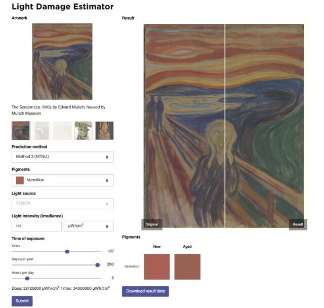 Em um recente anúncioa Universidade Norueguesa de Ciência e Tecnologia (NTNU) revelou o Light Damage Estimator, uma nova ferramenta digital que simula como os pigmentos usados ​​em pinturas podem desbotar com o tempo. A ferramenta possui fatores ajustáveis ​​para cor, fonte e intensidade de luz e tempo de exposição. A partir de agora, é mais adequado descrever cores particularmente vulneráveis ​​no livro de Edvard Munch O gritomas a equipe espera expandir as capacidades de seu modelo.