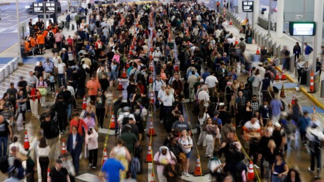 “Devido ao lapso de financiamento federal, os tempos de espera de segurança podem ser significativamente mais longos do que o normal. Os tempos de espera estão sujeitos a mudanças rápidas com base no volume de passageiros e na equipe da TSA. Por esses motivos, os relatórios de tempo de espera foram temporariamente suspensos. Aguarde significativamente mais tempo e verifique com sua companhia aérea o status atual do seu voo.”