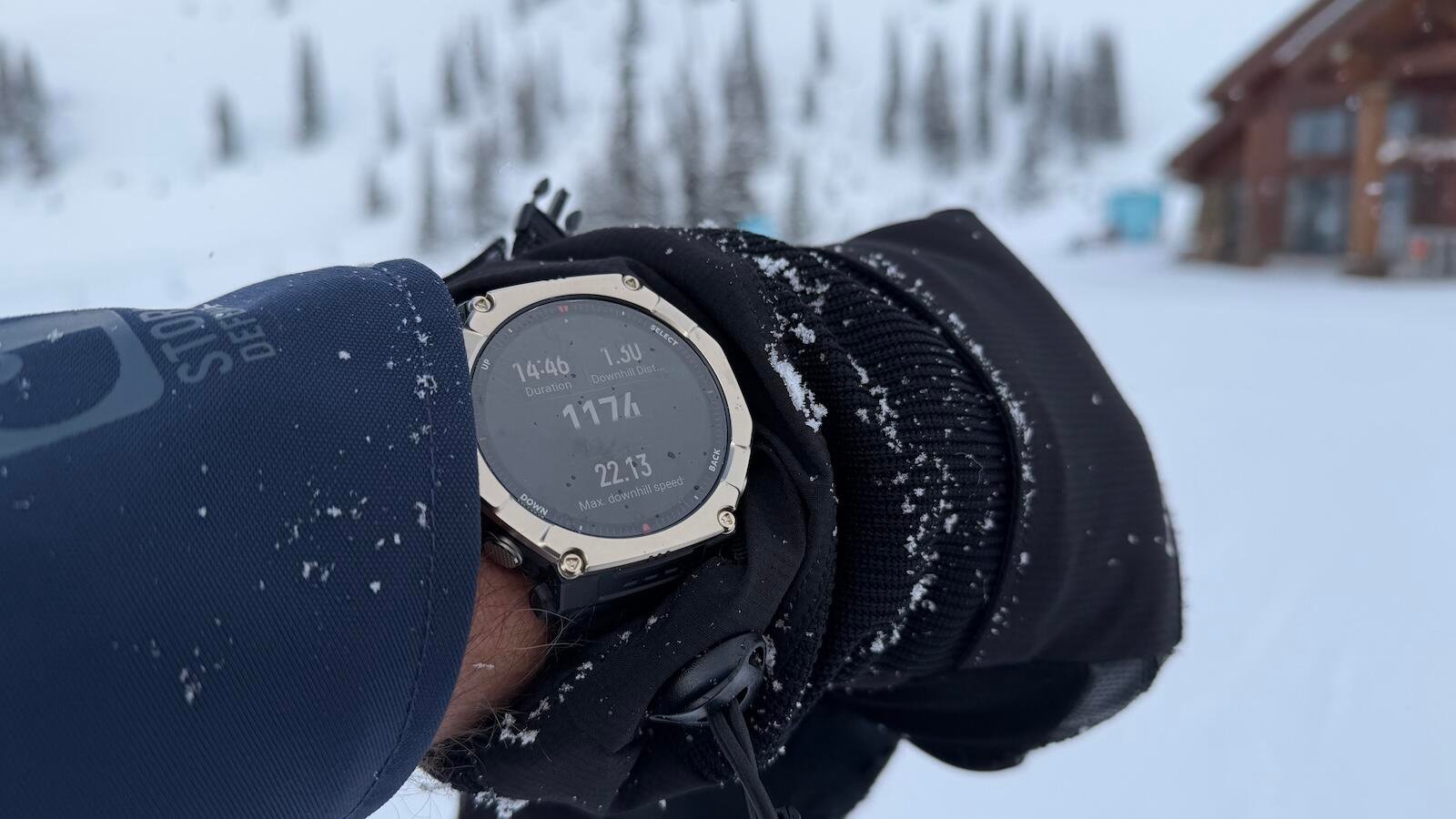 A tela grande e brilhante de 1,5 polegadas facilitou a visualização do mapa off-line da estação de esqui e de outros mapas pré-carregados no grande mostrador do relógio. Os tempos de subida e corrida foram precisos e, depois de completar uma corrida e subir, os resultados resumidos da minha corrida anterior soaram alto no alto-falante integrado. Esse recurso foi um toque legal, pois me deu motivação para superar esses resultados na próxima corrida.
