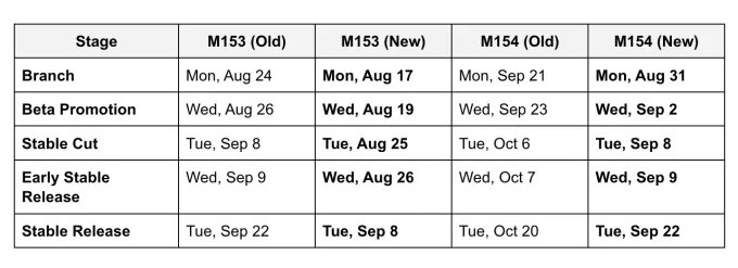 O novo cronograma de lançamento começa com as versões beta e estável (versão 153) do Chrome em 8 de setembro de 2026 e se aplica a todas as plataformas, incluindo desktop, Android e iOS. Nenhuma alteração está sendo feita em outras plataformas de lançamento antecipado, como os canais Dev e Canary.