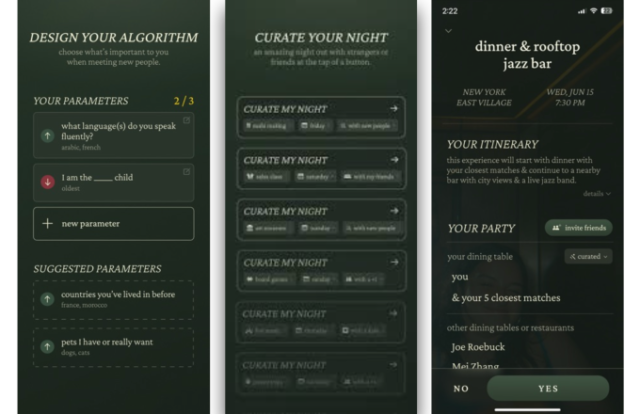 Os jantares acontecem em um restaurante selecionado nas noites de quarta-feira, às 19h. Para ajudar todos a quebrar o gelo, o aplicativo oferece um jogo com iniciadores de conversa. Após o jantar, há uma festa em um bar local.