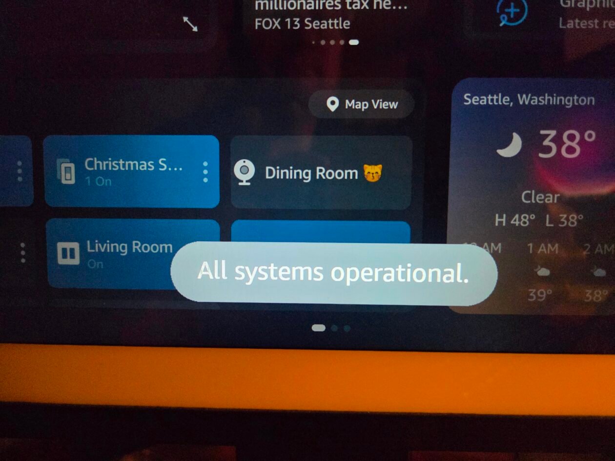 Alexa responde com “Todos os sistemas operacionais” no novo modo de personalidade Breve em um Echo Show. (Foto GeekWire / Todd Bishop)