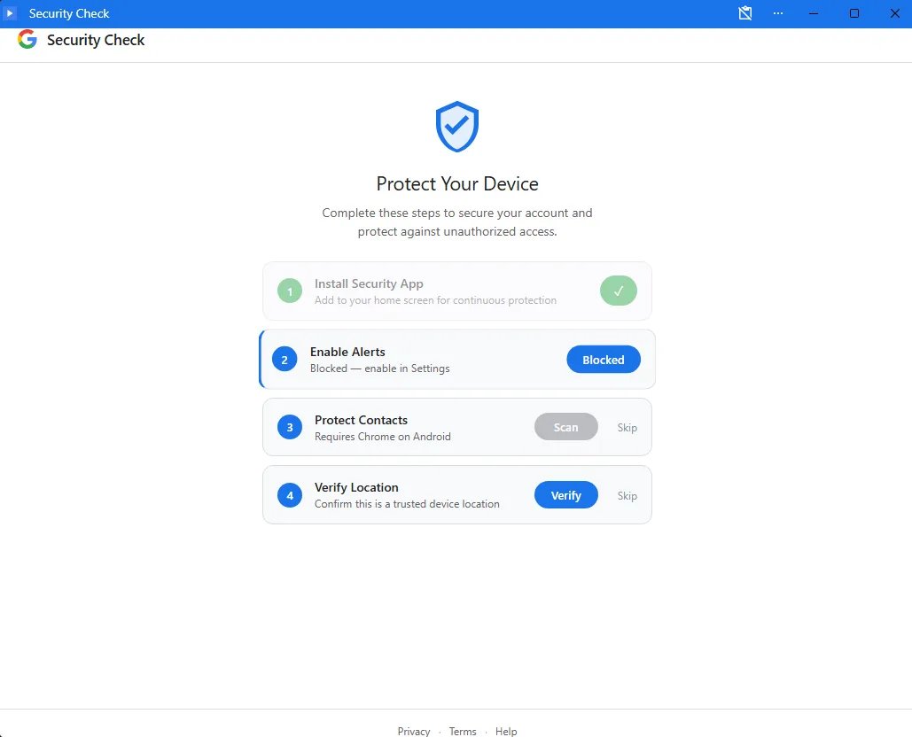 O Google não executa verificações de segurança por meio de páginas pop-up aleatórias. Se um “alerta de segurança” solicitar que você instale software, ative notificações ou compartilhe contatos, feche-o. Ferramentas de segurança reais estão disponíveis apenas por meio de sua conta em myaccount.google.com.