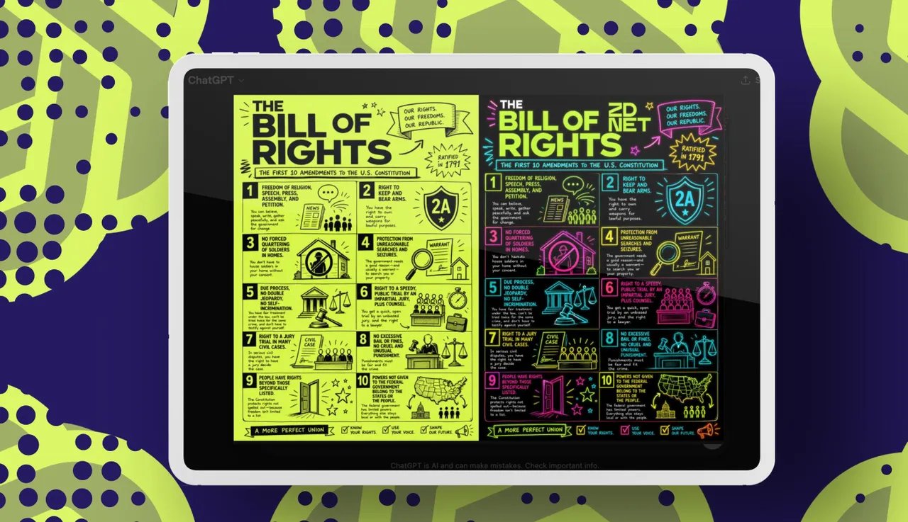 Aqui está o primeiro prompt: “Faça-me um esboço da Declaração de Direitos dos EUA. Use o estilo do logotipo ZDNET e faça as notas no estilo ZDNET.” Essa é a imagem à esquerda. Aqui está o segundo prompt: “Inclua o logotipo ZDNET e adicione mais cores estilo neon, talvez em um fundo preto”. Essa é a imagem à direita.