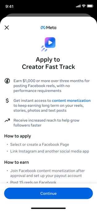 O programa também dá aos criadores qualificados acesso imediato às ferramentas de monetização de conteúdo do Facebook, sem exigir que eles atendam aos critérios usuais da plataforma, como uma contagem mínima de seguidores, permitindo-lhes continuar ganhando com as postagens mesmo após o término do programa Creator Fast Track.