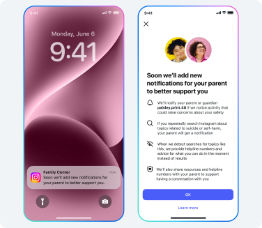 Pesquisas repetidas de termos ligados a suicídio ou automutilação durante um curto período acionarão o alerta dos pais. O recurso está disponível apenas por meio da ferramenta de supervisão parental do Instagram. Isso é separado, mas pode ser combinado com uma conta adolescente, destinada a jovens entre 13 e 17 anos.
