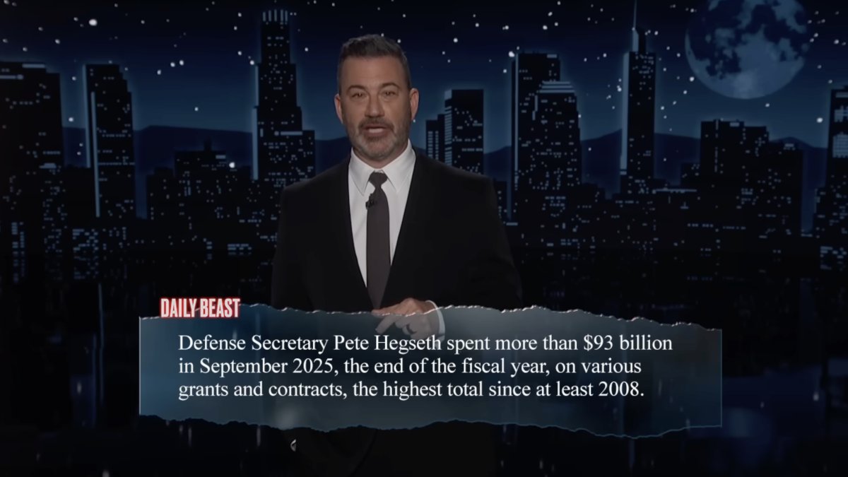 O departamento de defesa de Pete Hegseth não tem sido tímido quanto aos seus gastos, de acordo com um novo relatório que afirma que o departamento gastou US$ 93 bilhões somente em setembro de 2025 – e Jimmy Kimmel não está impressionado.