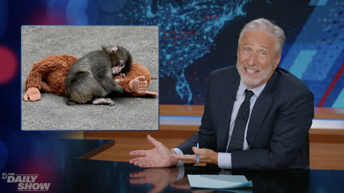 A internet está torcendo por Punch, o macaquinho abandonado que encontrou conforto com um brinquedo de pelúcia – mas Jon Stewart tem outras ideias.