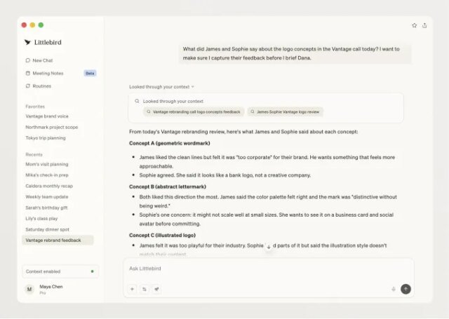 A ideia central por trás do produto é que, como ele lê sua tela o tempo todo, você não precisa fornecer contexto adicional para produtividade. A startup acredita que, embora muitas ferramentas de IA tentem distraí-lo, o Littlebird pode trabalhar em segundo plano e só pode aparecer quando você quiser.