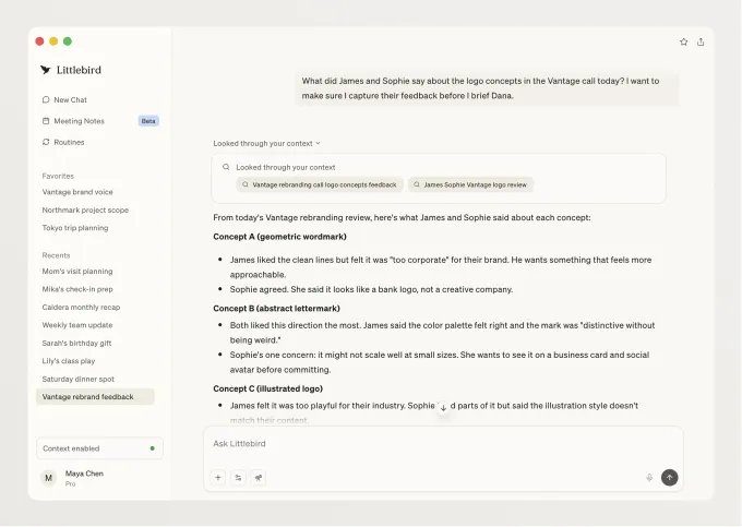 “Começamos quando Alap apresentou um problema interessante que a IA tratará do seu [users’] dados. As modelos não sabem nada sobre você e isso limita sua utilidade. Estávamos pensando em vários paradigmas de UI e sistema operacional que provavelmente estariam prontos para serem interrompidos com IA e que deram início ao Littlebird como um projeto”, disse Green ao TechCrunch por telefone.
