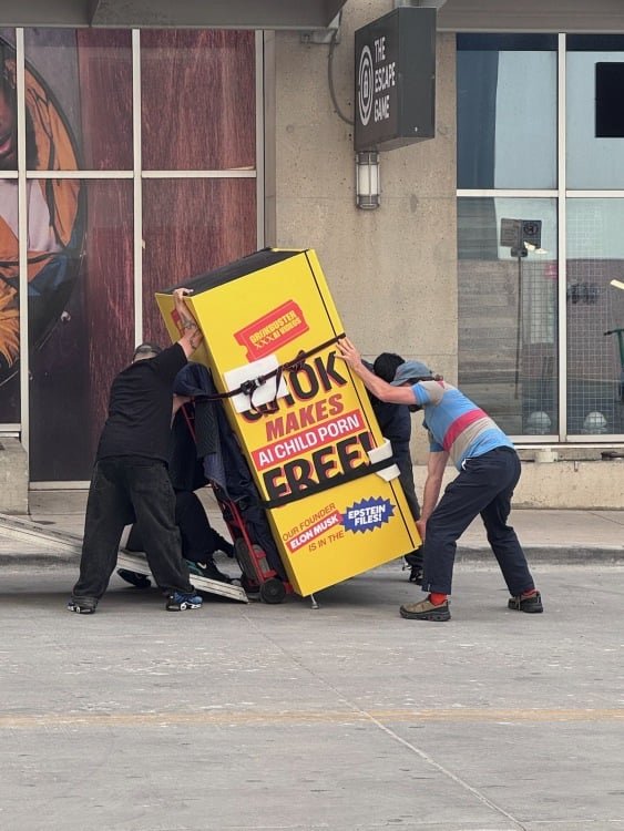 Mashable testemunhou um grupo de quatro homens instalando a peça de arte de protesto da guerrilha na esquina da Red River Street com a 4th Street, no centro de Austin. Após uma breve instalação, os transeuntes começaram a colecionar DVDs intitulados “Elon’s Epstein Files”. A máquina de venda automática está coberta de slogans anti-Elon Musk, e as mensagens na máquina dizem “Grok torna a pornografia infantil com IA gratuita!” e “Nosso fundador, Elon Musk, está nos Arquivos Epstein.”